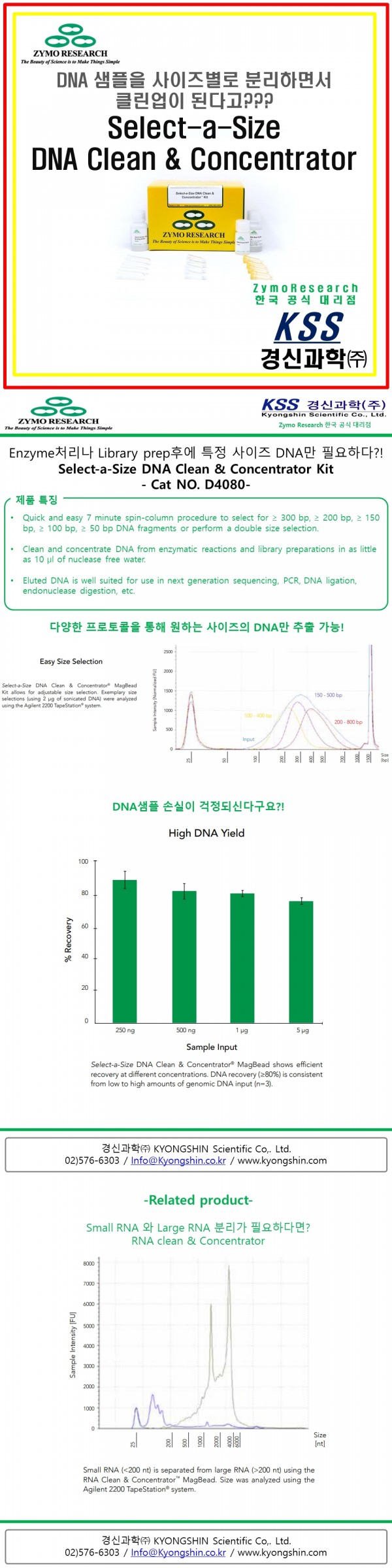 Zymo Research사의 놀라운 Column과 Buffer기술이 만들어낸 이 키트는 Enzyme처리나 Library prep 후에 원하는 사이즈의 DNA만 추출이 가능합니다. 다양한 프로토콜을 통해 여러 가지 사이즈의 DNA를 추출이 가능합니다. 또한 빠르고, 간편하며 , 높은 수율로 DNA를 Clean-up 합니다.  Single column type과 Magbead type등 다양한 포맷을 통해 원하는 제품을 선택해 보세요. #경신과학 #KSS #Zymo #ZymoResearch #SelectASizeDNACleanConcentrator #Libraryprep #Cleanup #NGS