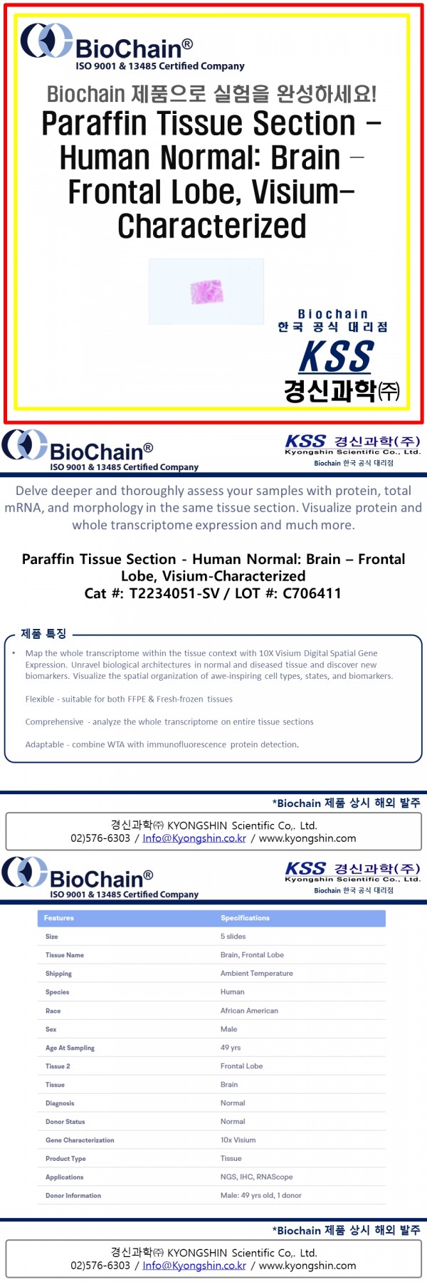 biochain] Paraffin Tissue Section - Human Normal: Brain – Frontal Lobe, Visium-Characterized 페이지 정보 작성자 Kyongshin 작성일22-09-02 16:18 관련링크 https://www.biochain.com/t2234051-sv-product 10803회 연결 이전글 다음글 목록 본문 #경신과학 #kss #biochain #Paraffin #Tissue #Slide #NGS #IHC #RNAscope 이전글 다음글 목록