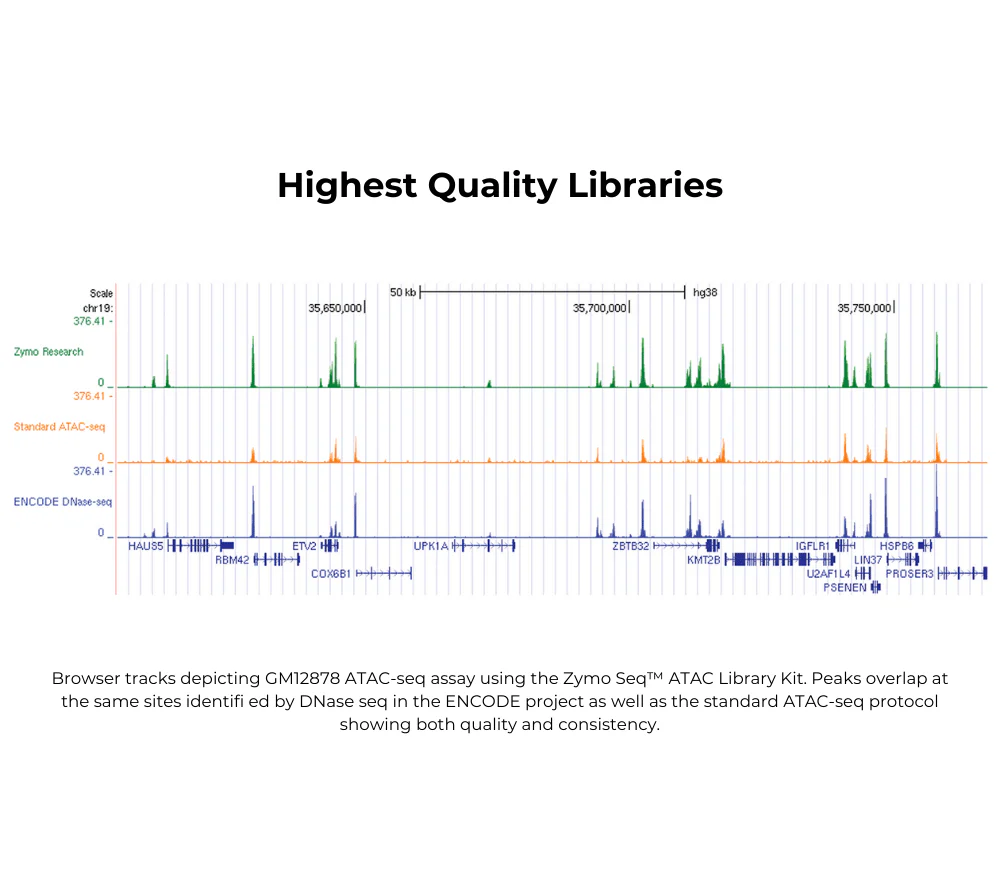 Zymo-Seq ATAC Library Kit provides a simple and streamlined workflow for Assay for Transposase Accessible Chromatin with high throughput Sequencing (ATAC-Seq) library preparation from mammalian cell and tissue input. This all-inclusive kit features an easy to follow protocol capable of preparing ATAC-Seq libraries from as little as 50,000 cells in as little as 4 hours with minimal hands on time.