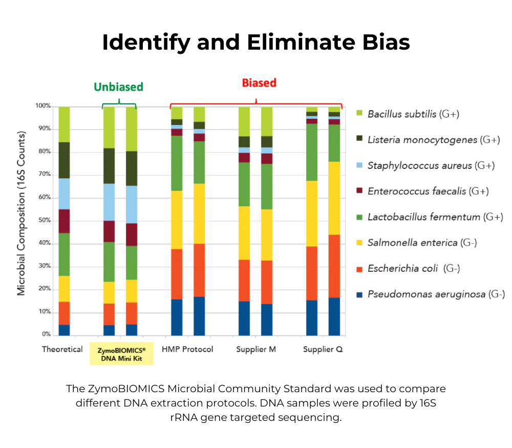 We recommend working backwards from the analysis. First optimize your library prep with the ZymoBIOMICS Microbial Community DNA Standard (D6305, D6311) to assess bias in PCR, sequencing, bioinformatics, etc. Once your results have low/no bias when compared to the theoretical composition, then use the whole cell ZymoBIOMICS Microbial Community Standard (D6300, D6310) to assess bias in lysis efficiency.